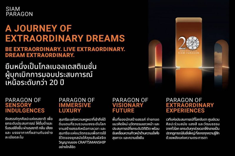 และในปีนี้ สยามพารากอนฉลองครบรอบ 20 ปีสุดยิ่งใหญ่ภายใต้แนวคิด “A Journey of Extraordinary Dreams” ผนึกกำลังทั้ง ศูนย์ฯ และห้างฯ มอบประสบการณ์เหนือระดับกับกิจกรรมสุดพิเศษ ระหว่างวันที่ 29-30 พ.ย. 2568 เนรมิตทุกตารางเมตร ตั้งแต่ชั้น B ถึงชั้น 5 ทุกชั้นทุกแผนกให้เป็นอาณาจักรแห่งความสุข หรรษา และสร้างแรงบันดาลใจให้แก่กลุ่มลูกค้าครอบคลุมทุกเป้าหมาย อาทิ