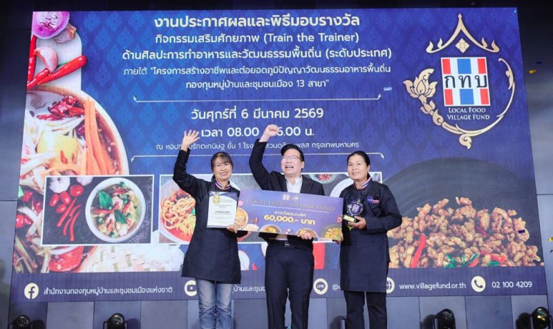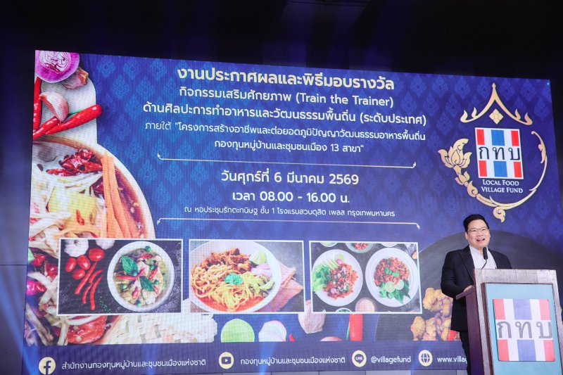 สำนักงานกองทุนหมู่บ้านและชุมชนเมืองแห่งชาติ จัดกิจกรรมเสริมศักยภาพ (Train the Trainer) ด้านศิลปะการทำอาหารและวัฒนธรรมพื้นถิ่น (ระดับประเทศ) ภายใต้ “โครงการสร้างอาชีพและต่อยอดภูมิปัญญาวัฒนธรรมอาหารพื้นถิ่น กองทุนหมู่บ้านและชุมชนเมือง 13 สาขา” ระหว่างวันที่ 4 - 6 มีนาคม 2569 ณ หอประชุมรักตะกนิษฐ ชั้น 1 โรงแรมสวนดุสิตเพลส กรุงเทพมหานคร