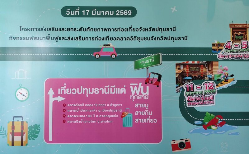 2.งานอบรมพัฒนา ฟื้นฟู และส่งเสริมการท่องเที่ยวตลาดวิถีชุมชน จังหวัดปทุมธานี ในวันที่ 17 มีนาคม 2569 ณ โรงแรมทินิดี บางกอก กอล์ฟ คลับเวลา 08.00 - 17.00 น.